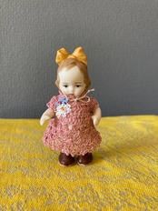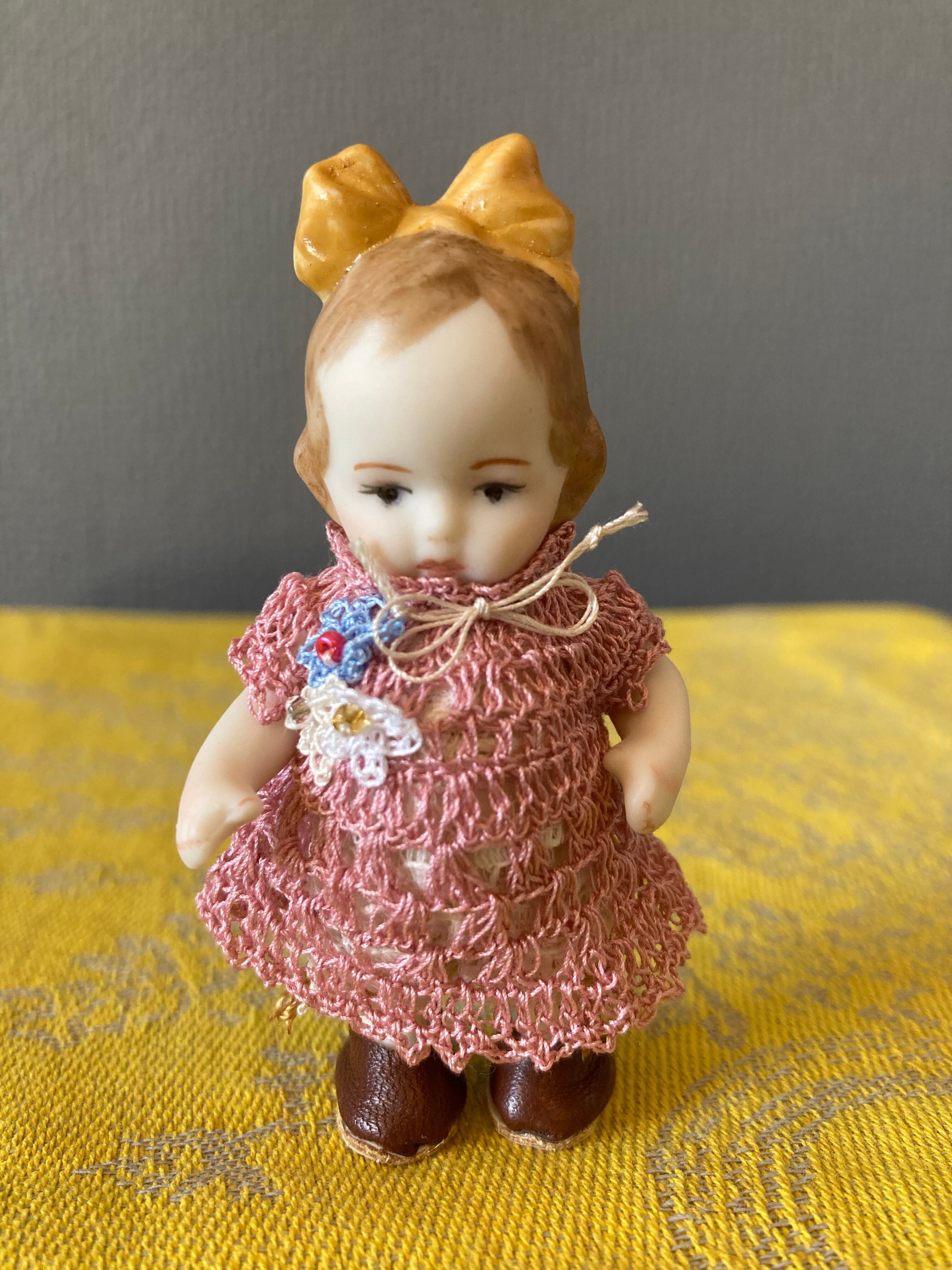 ボディ部分は全身陶器で、下着、革靴、レース糸で編まれたピンクのドレスを着用しています。