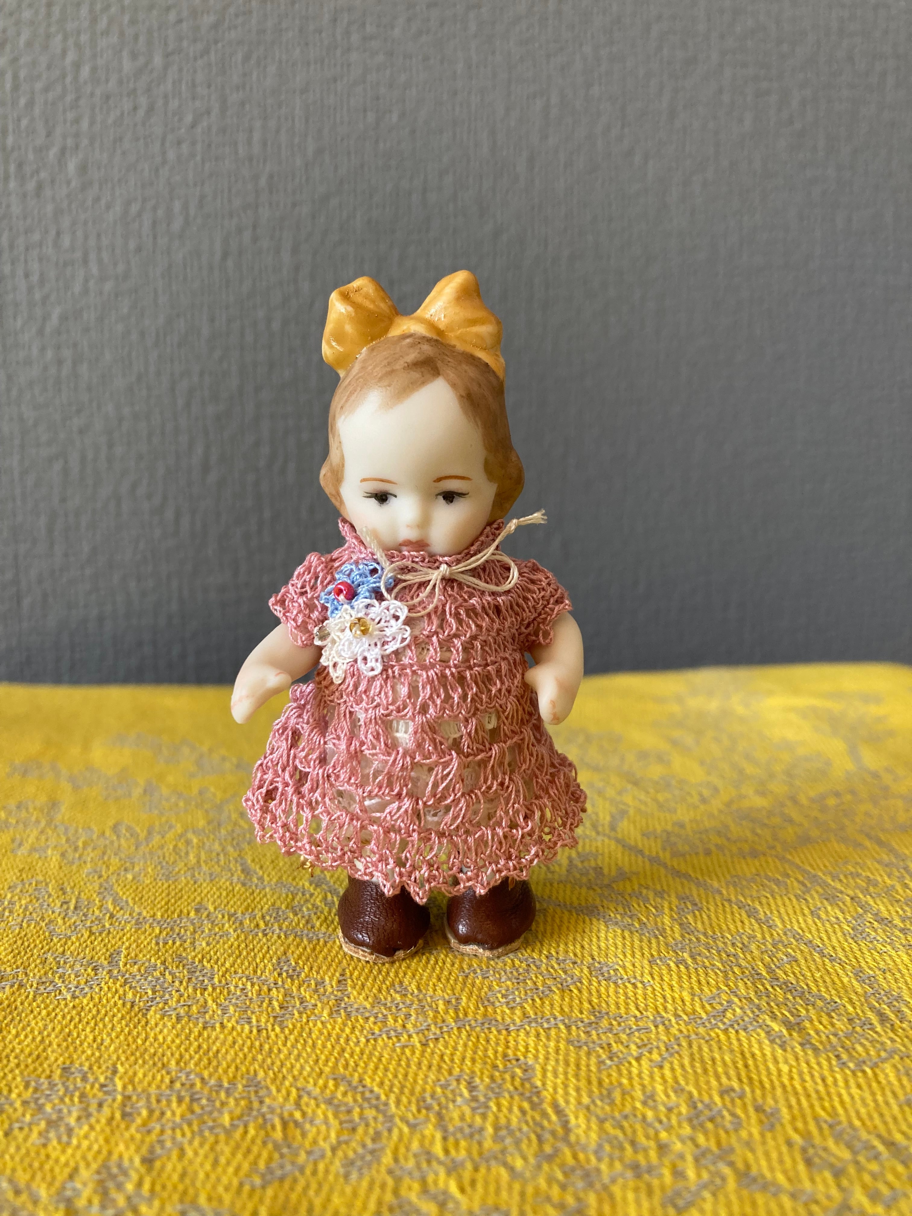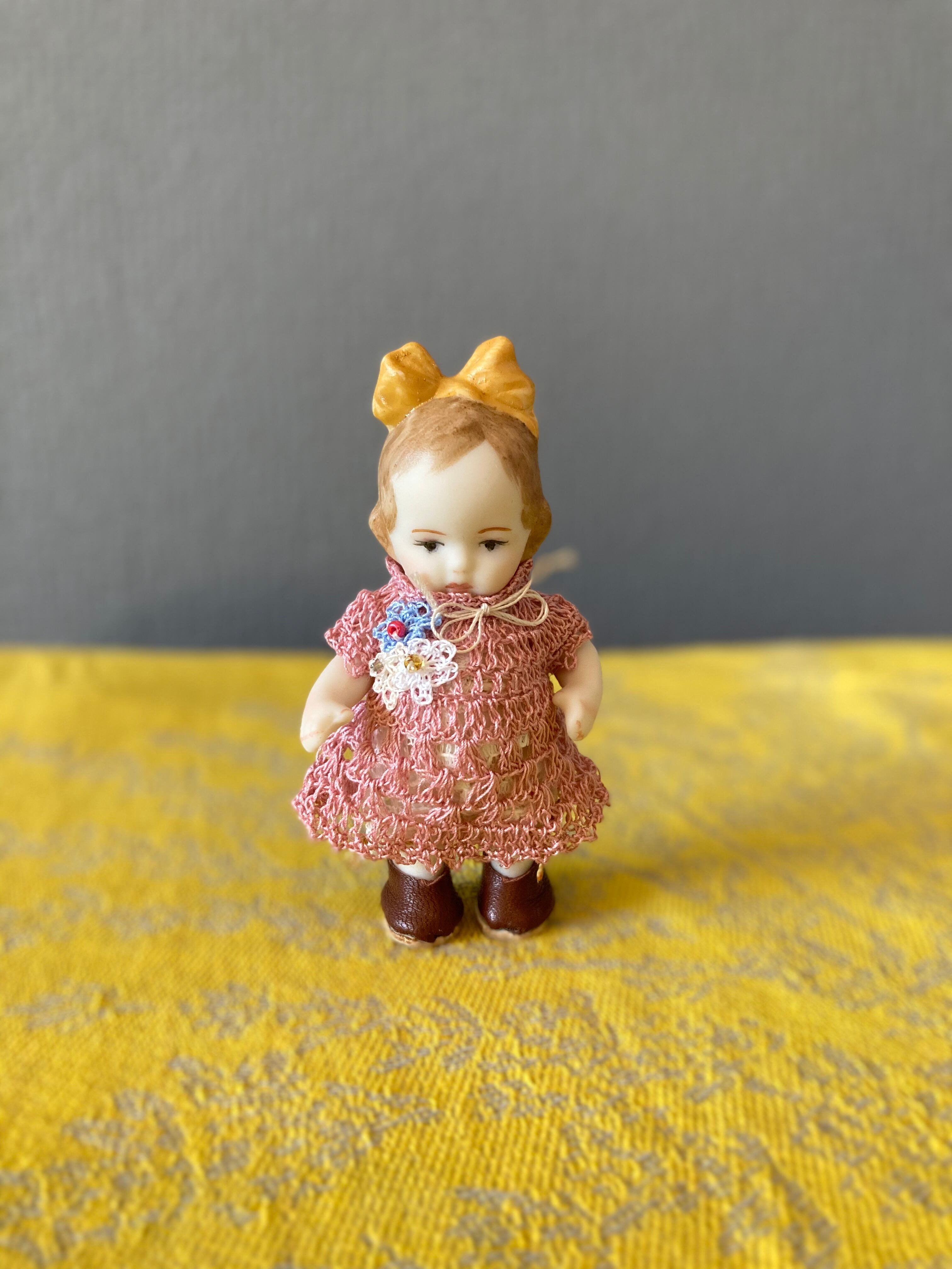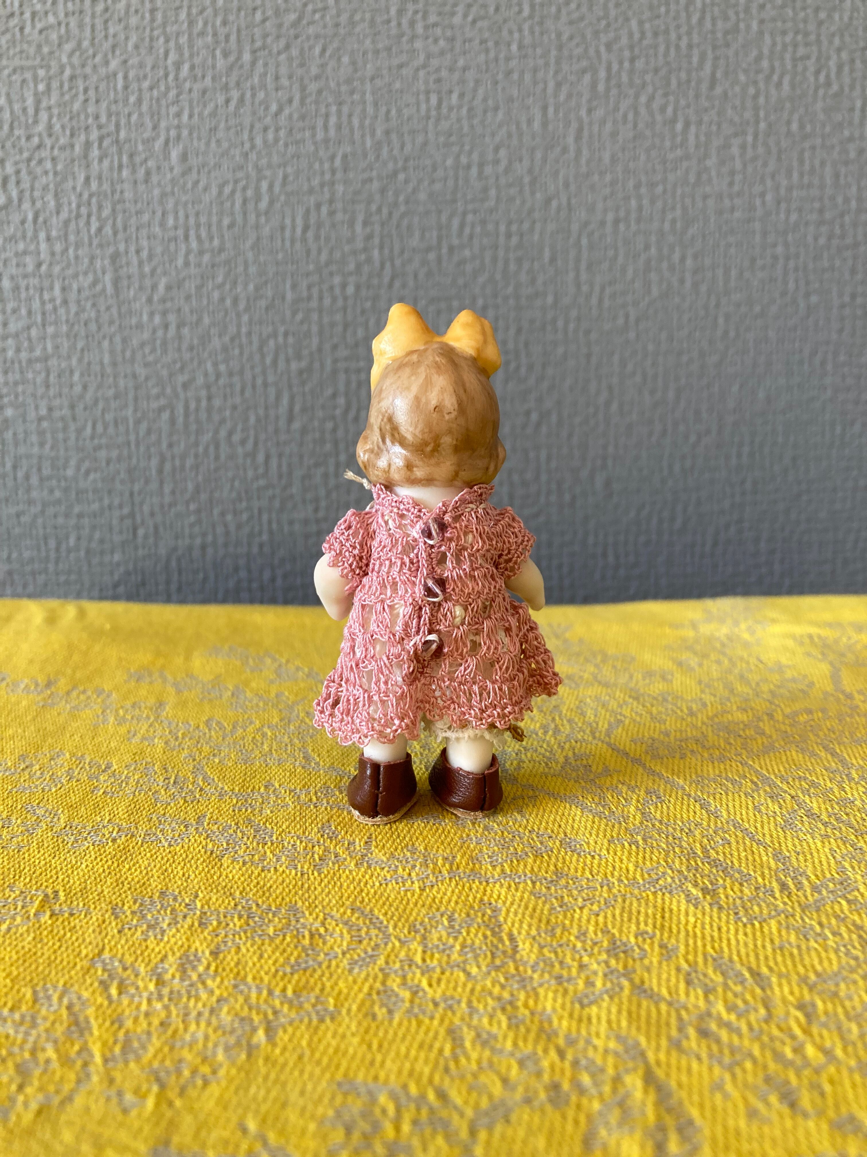 頭のリボンの先から足先までの長さが8.0cmほどの、小さな小さなお人形です。
