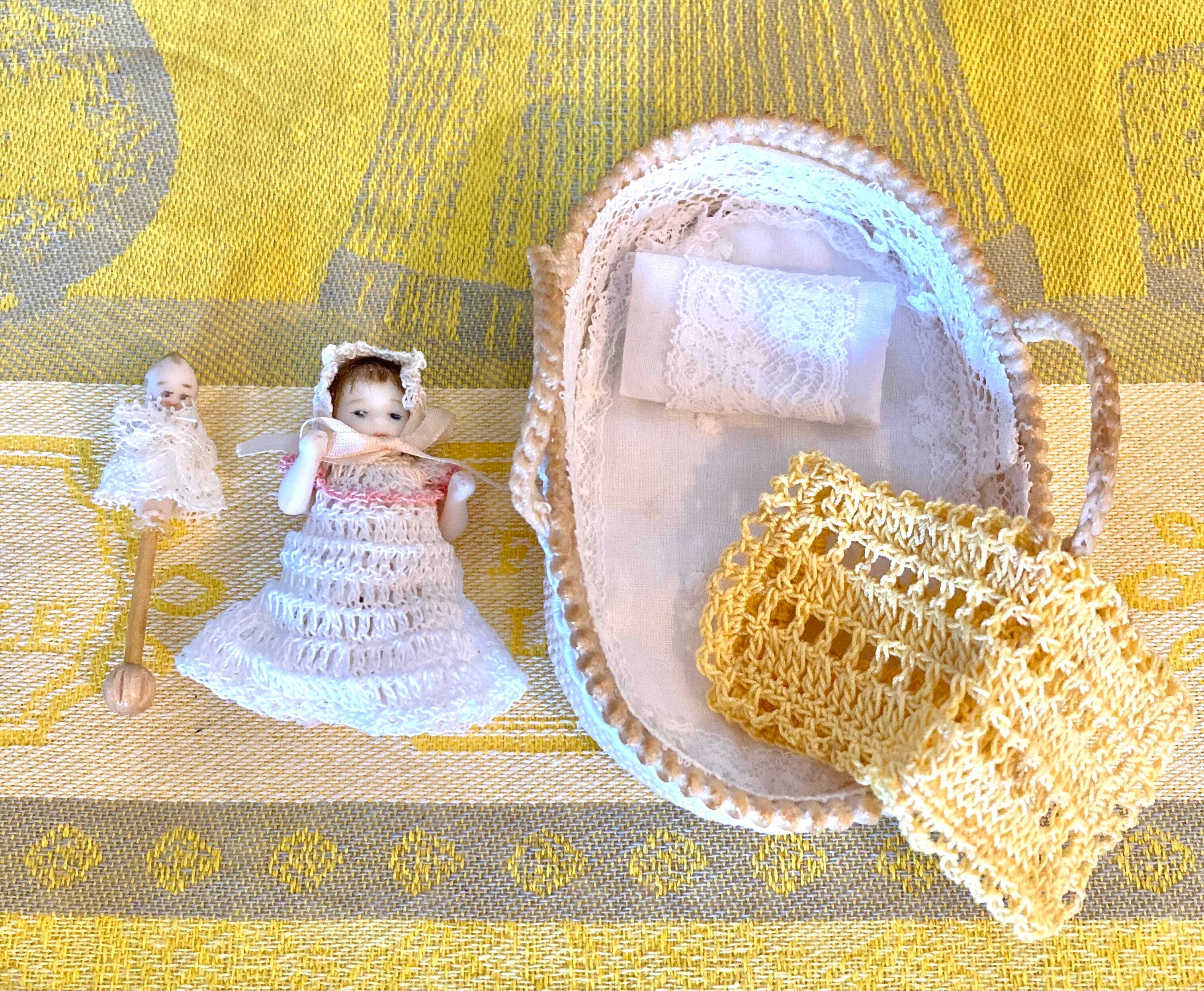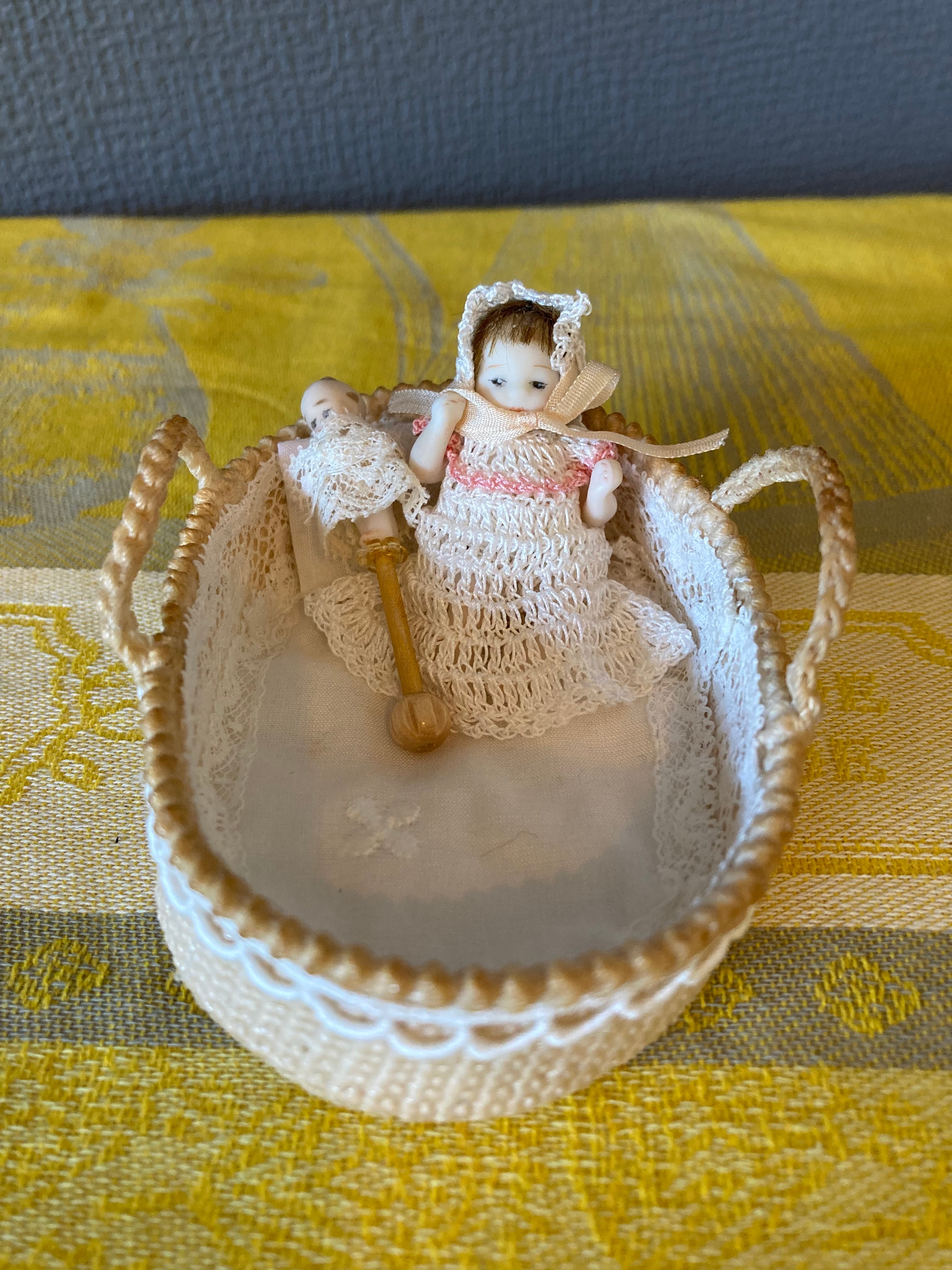 ボディ部分は全身陶器で、レース糸で編んだ下着(パンツのみ)&ドレス、帽子を着用してベビーかごに寝ています。ベビーかごの中にはブランケット、枕、キューピーのおもちゃが含まれます。
