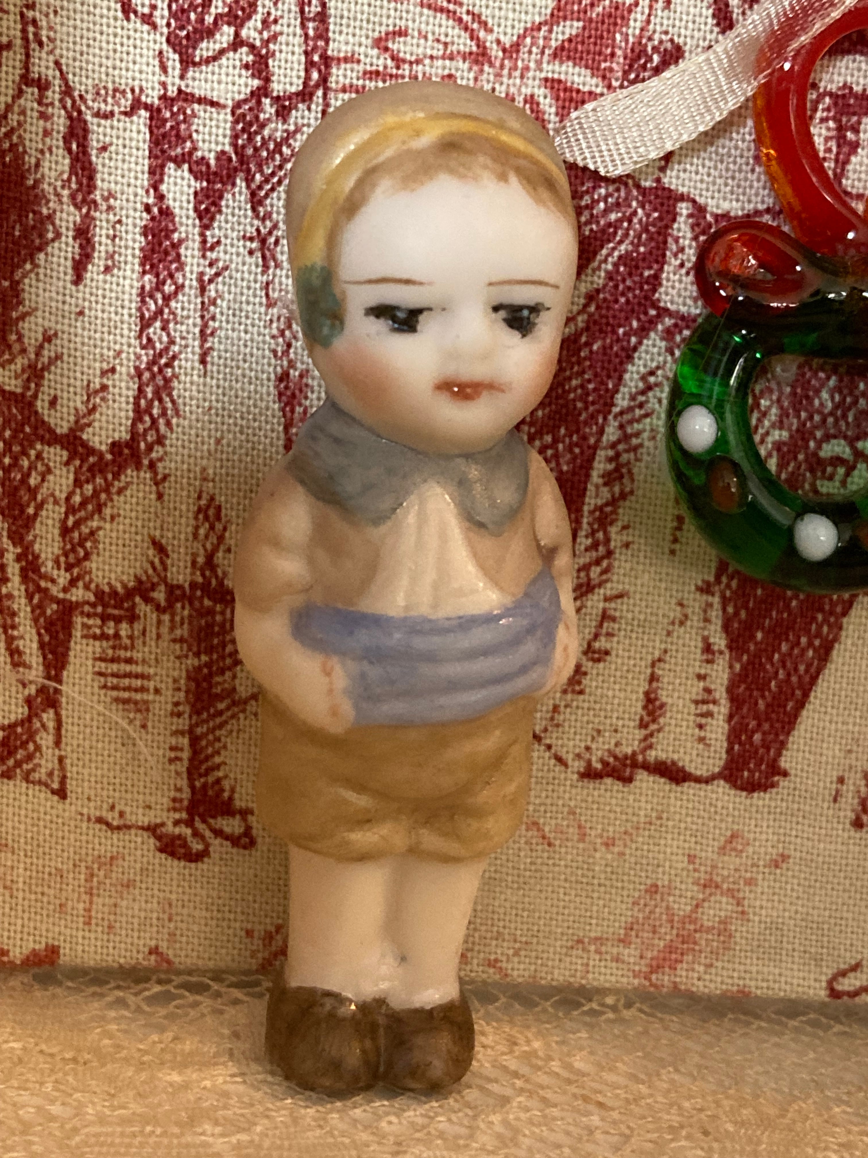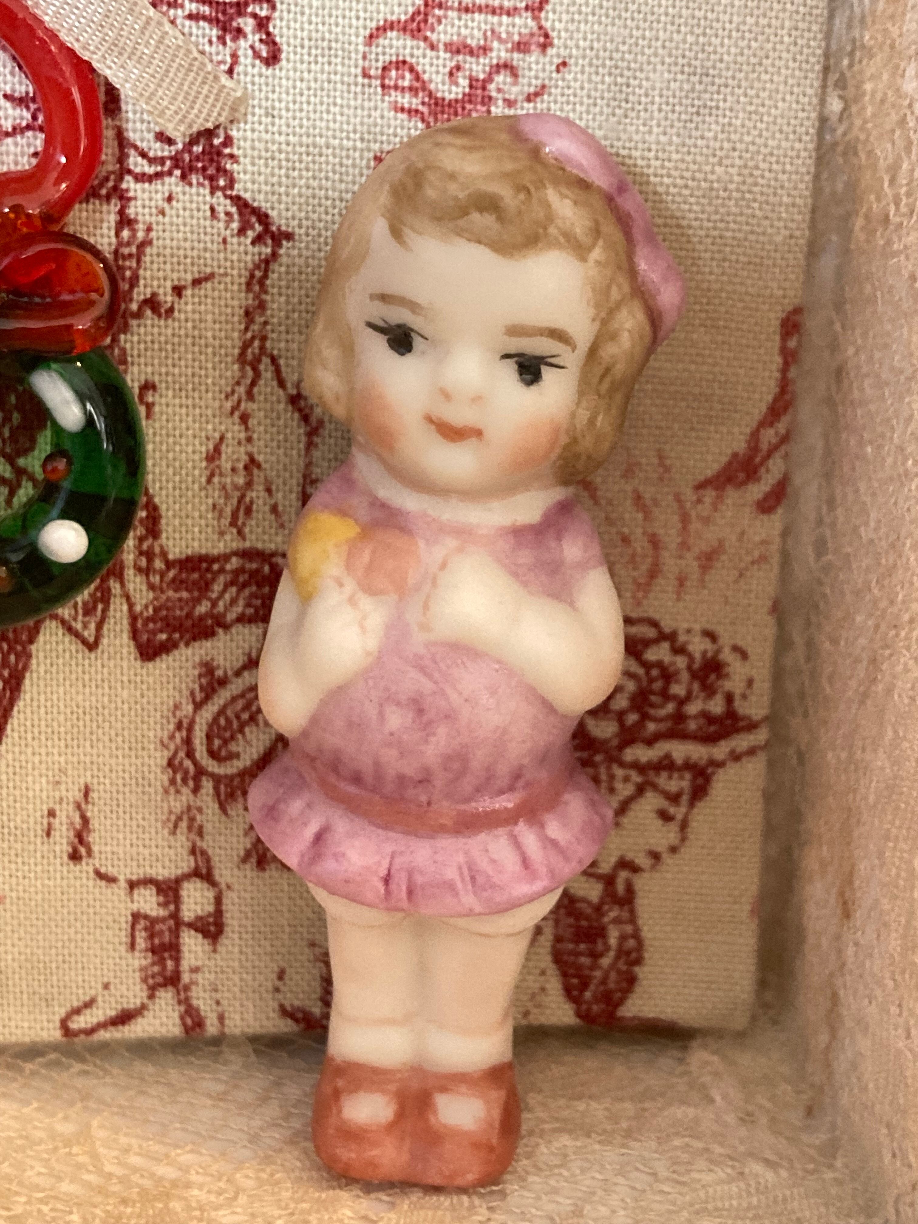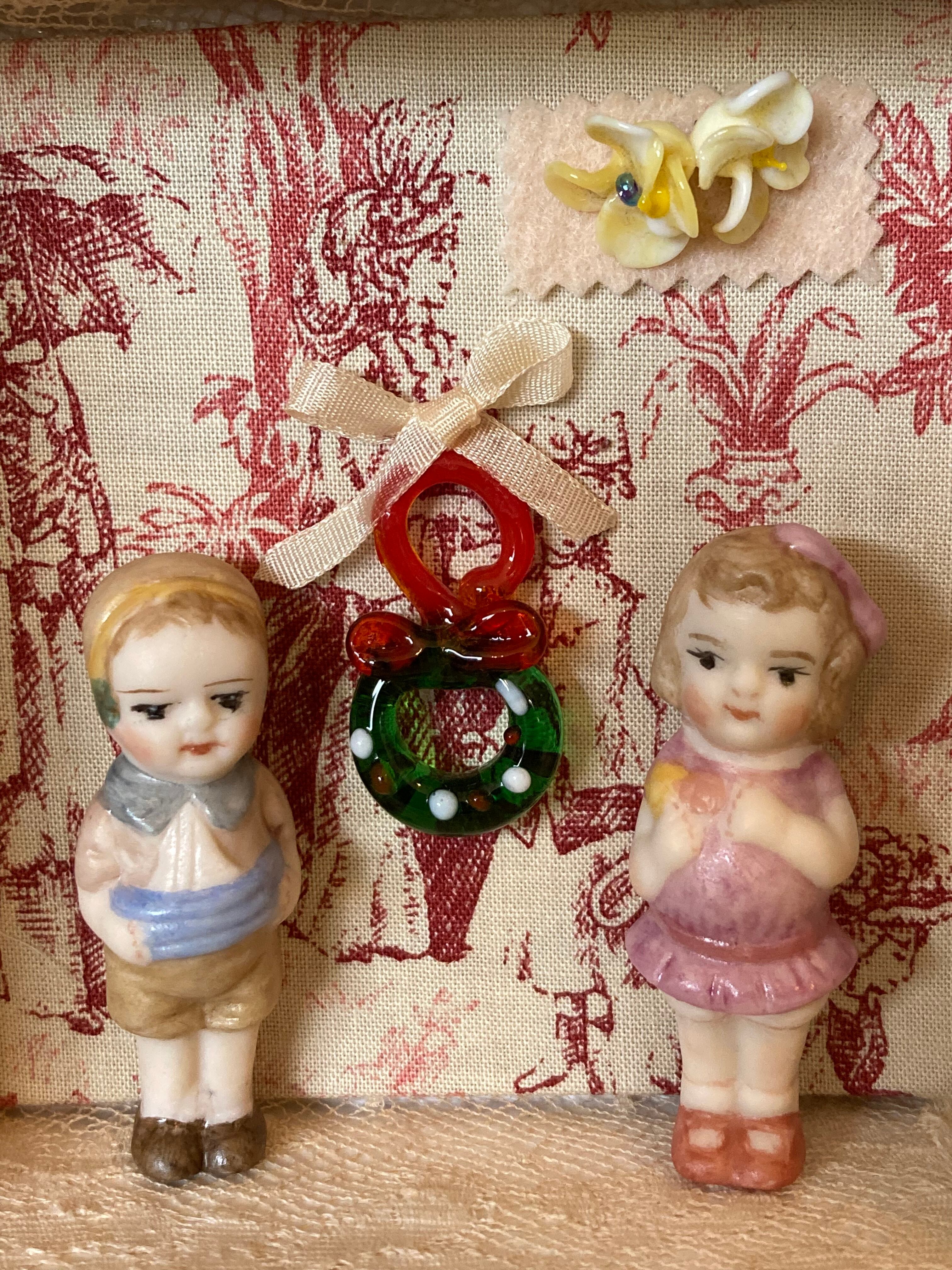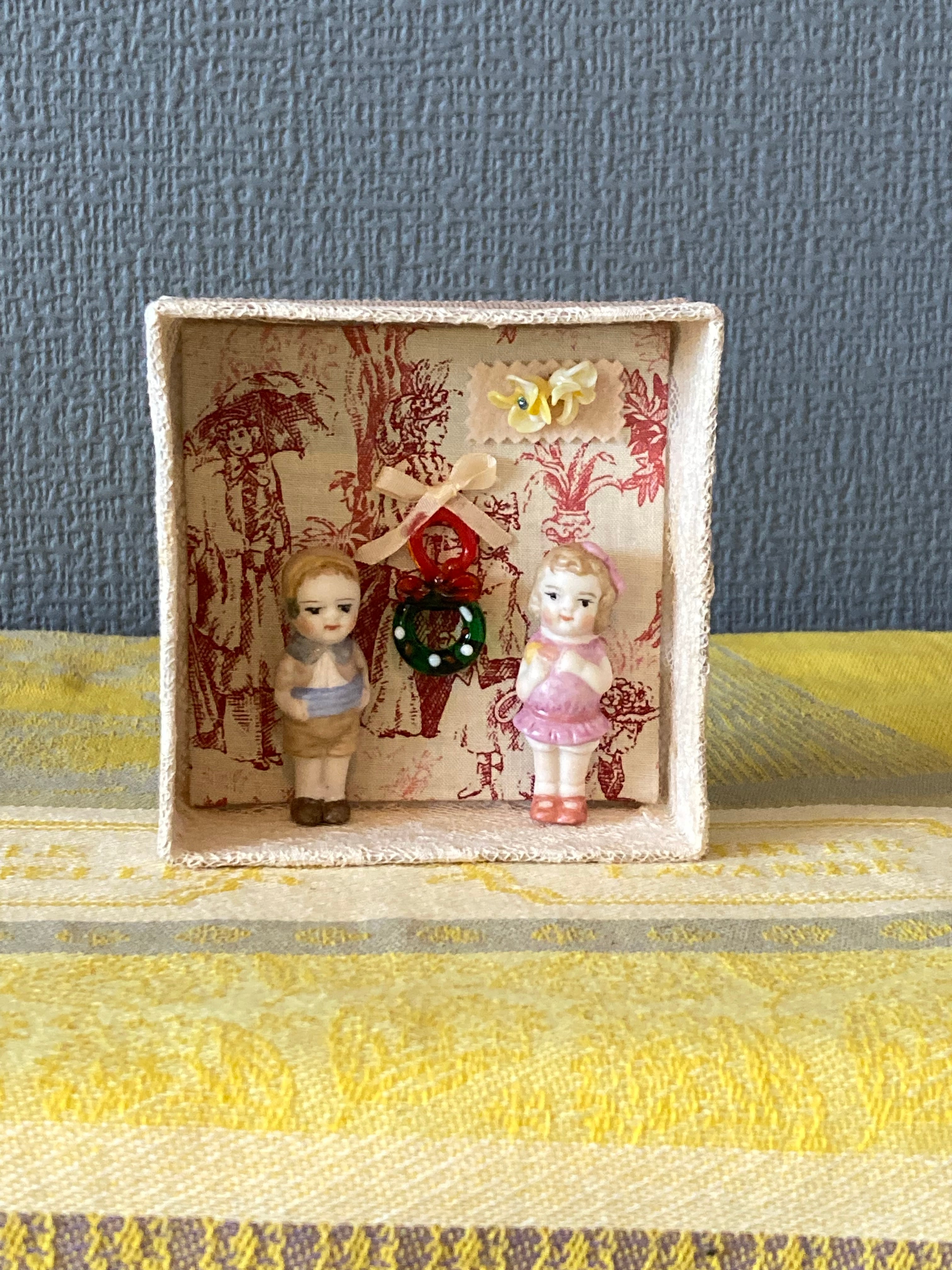 お人形のボディ部分は全身陶器で、BOX内にはクリスマスのリース飾りがついています。お人形2体は自由に取り外せます。